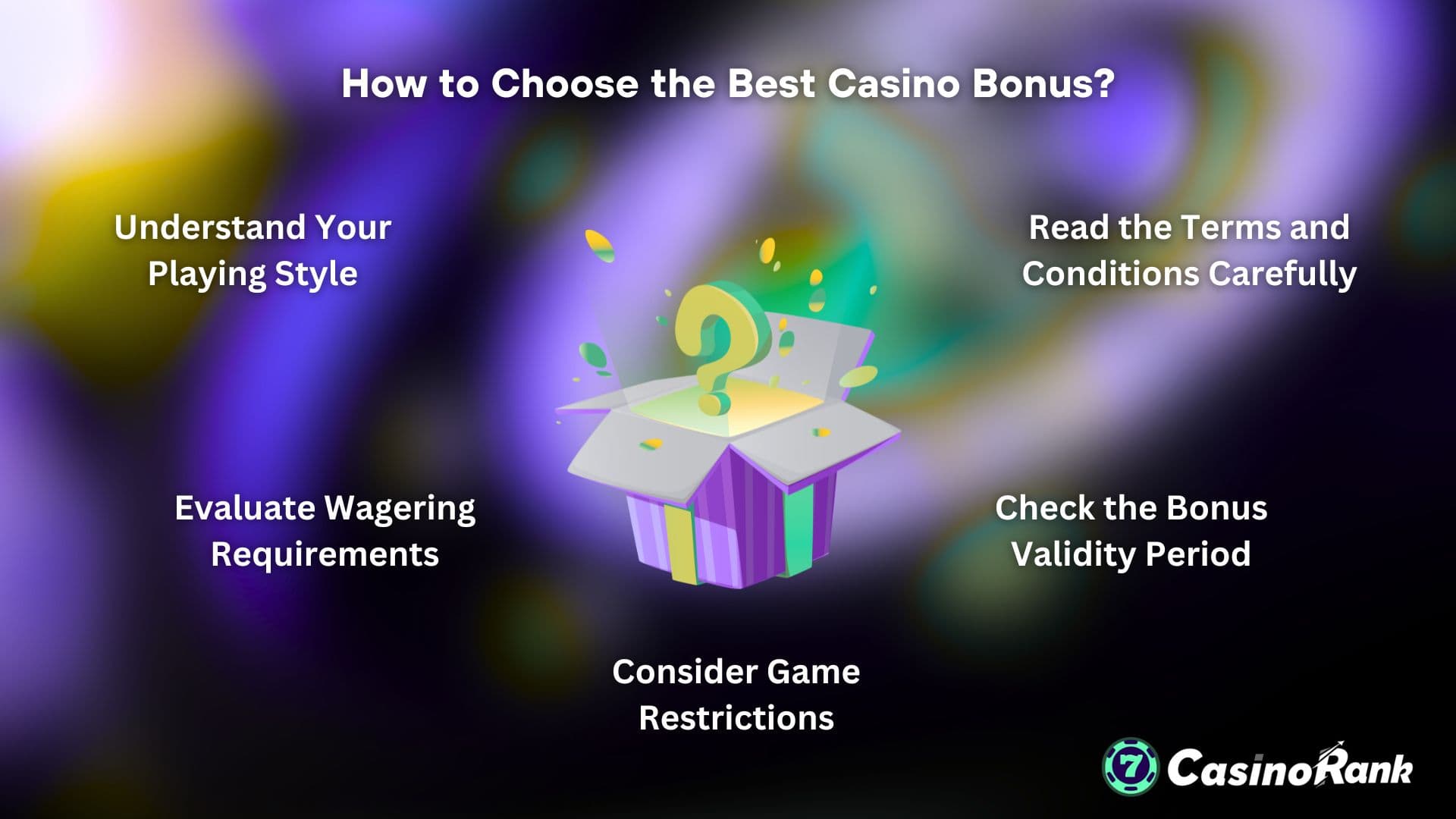 Elegir los mejores bonos de casino online puede ser complicado, ya que hay muchas ofertas disponibles. Debes considerar varios factores para asegurarte de que obtienes un bono que se adapta a tu estilo de juego y preferencias.